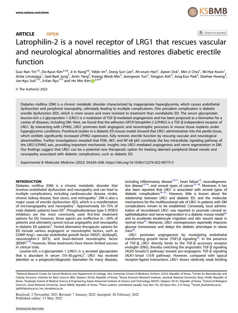 Latrophilin-2 is a novel receptor of LRG1 that rescues vascular and neurological abnormalities and restores diabetic erectile function - Diabetes mellitus (DM) is a chronic metabolic disorder that involves endothelial dysfunction and neuropathy and can lead to multiple complications, including cardiovascular disease, stroke, chronic kidney disease, foot ulcers, and retinopathy1. DM is also a major cause of erectile dysfunction (ED), which is a manifestation of microangiopathy and neuropathy1. Approximately 50–75% of male diabetic patients have ED2. Phosphodiesterase type 5 (PDE5) inhibitors are the most commonly used first-line treatment options for ED; however, these agents are ineffective in ~30% of patients and ultimately cannot rescue angiopathy and neuropathy in diabetic ED patients3. Tested alternative therapeutic options for ED include various angiogenic or neurotrophic factors, such as COMP-Ang1, vascular endothelial growth factor (VEGF), dickkopf2, neurotrophin-3 (NT3), and brain-derived neurotrophic factor (BDNF)4,5,6,7,8; however, these treatments have shown limited success in clinical trials.